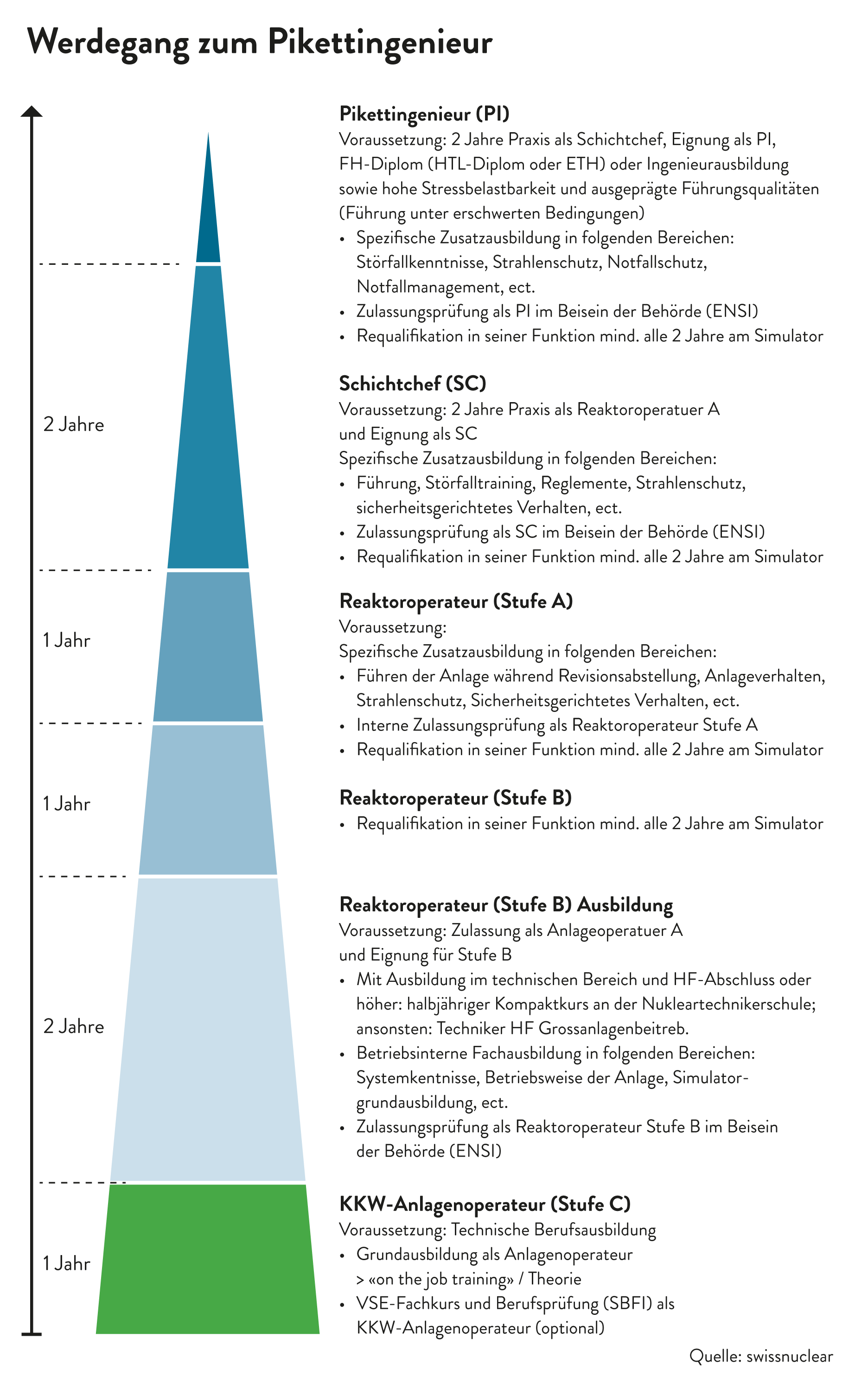 Der dreijährige Lehrgang bildet die Basis für die Ausbildung zulassungspflichtiger Reaktoroperateure. Interessierte müssen sich über eines der Kernkraftwerke bei der Nukleartechnikerschule anmelden.